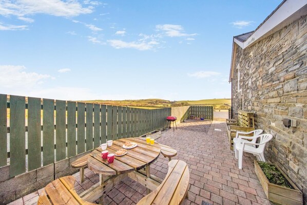 Fenced in enclosed private area with seated bench table, BBQ and small grassed area.