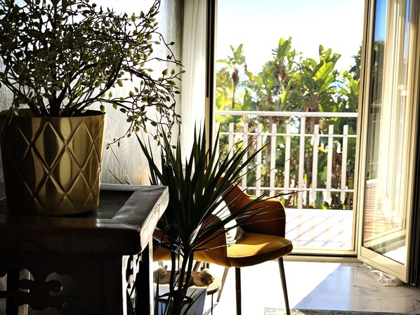 Patios: Access from the front living room, from inside the bedroom, and also from the kitchen. With a table and chairs to enjoy a relaxing moment looking at the palms after a long day or for a quick coffee.