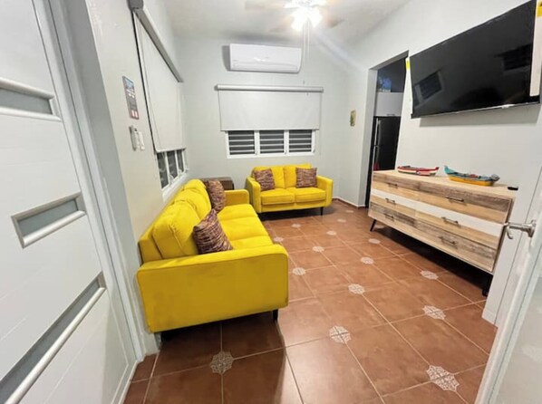 - **Living Area:** stylish and cozy sofa and a flat-screen TV