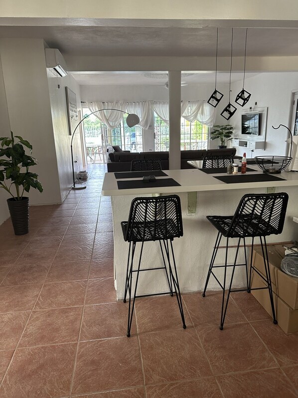 Luxurious, all brand new ...3 bedrooms, living room, dining room and kitchen with 2 full bathrooms. 5 Fully remote smart ACs (2 extra hygienic) 4 fully remote 52" Ceiling Fans, 4 Smart TVs. 1 King bedroom, 2 Queen bedrooms with pillow top mattresses for a comfortable nights rest, plus available upon request, 2 Air Mattresses for up to2 additional persons at the specified additional per person rate ...making this the coolest space on the island.