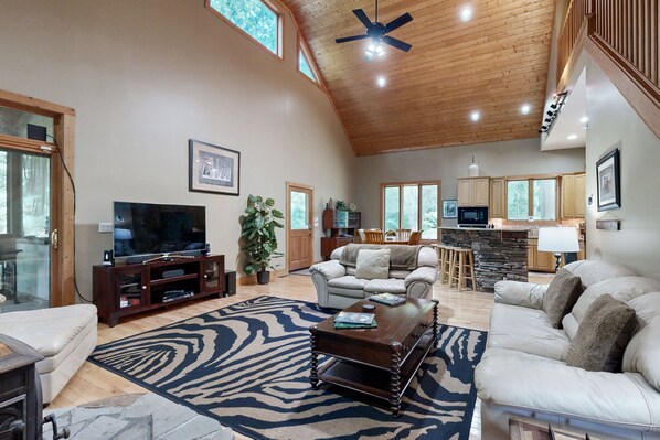 The Great Room features 25 cathedral ceilings, a wood-burning fireplace, and a smart TV. Doors lead to the screened porch.