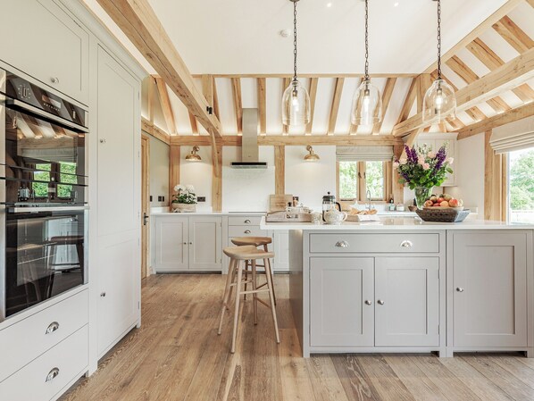 Escape to the country in this luxury oak framed barn with large suite style bedroom suites and oak framed bi-fold doors opening directly onto the uninterrupted Hampshire countryside - perfect for a large family.. 1 step to entrance.