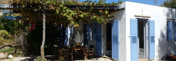 La terrazza coperta offre uno spazio esterno perfetto per rilassarvi e socializzare nelle calde serate estive. Con ambienti flessibili e atmosfera accogliente, la Camera 18 è la base ideale per scoprire Amorgos insieme.