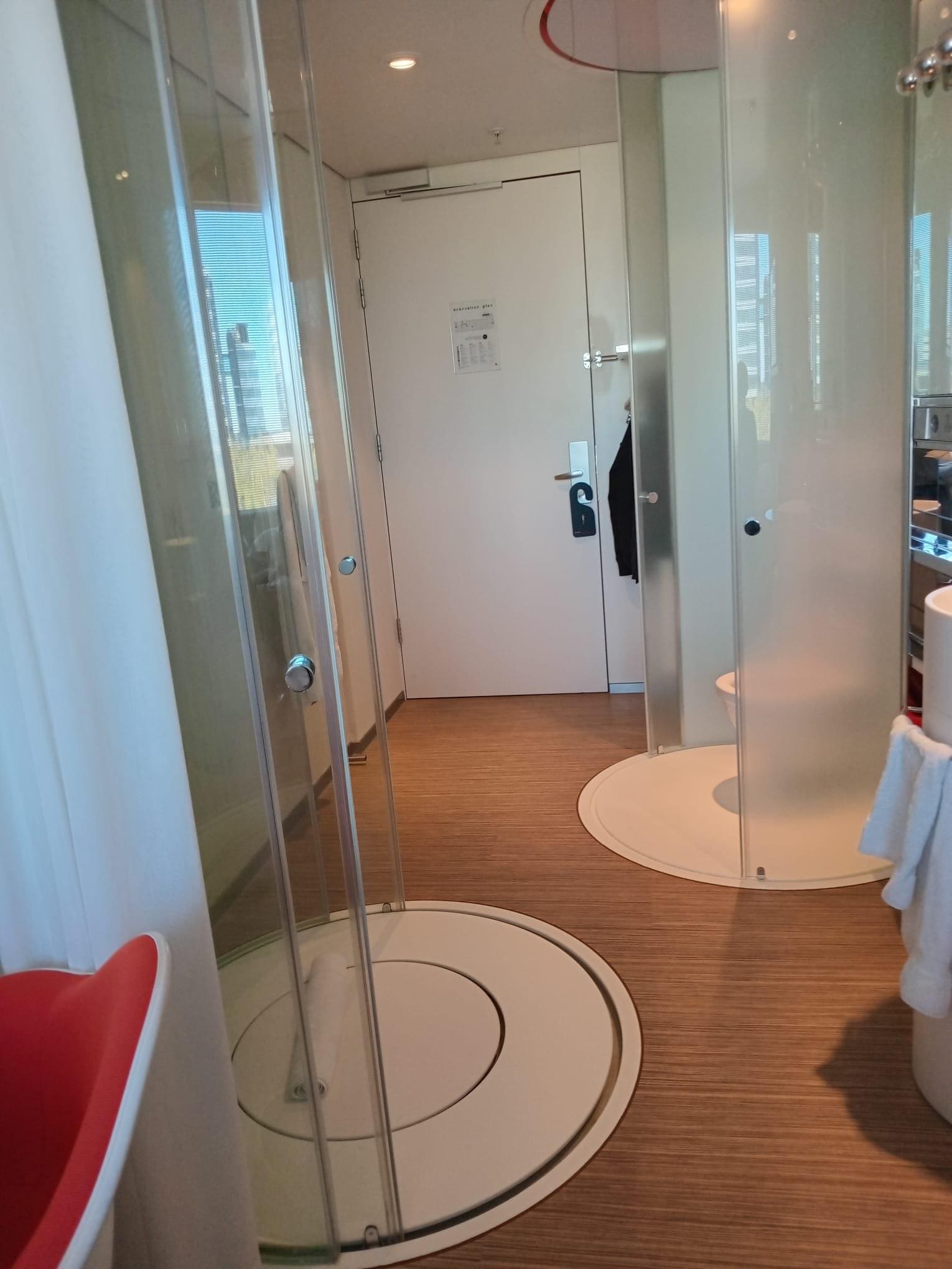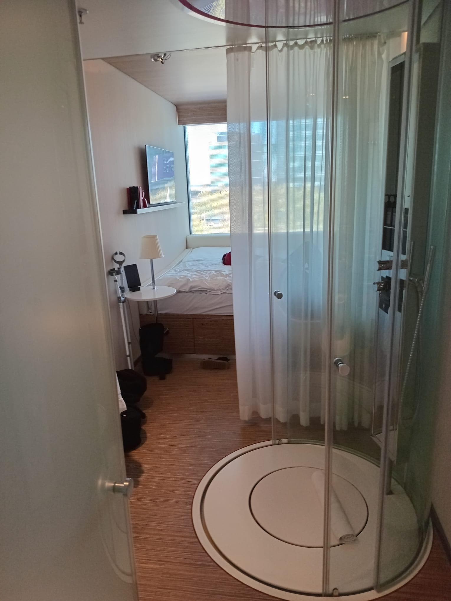 Nice thought out room but very small for the rpice. "all in one" bathroom shower bed all in the same area with a round glass closure. v. quick efficient checkin and out.