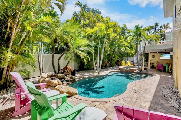 Step into your private backyard oasis where a heated pool and spa are surrounded by lush greenery and plenty of lounge seating. Fire up the BBQ grill and enjoy meals at the outdoor dining table, catch your favorite shows on the poolside TV, or relax with family and friends under the Florida sunshine. A designated outdoor golf cart charging outlet adds extra convenience for island exploring. For more fun, head indoors to the game area featuring a pool table, shuffleboard, and cozy seating.