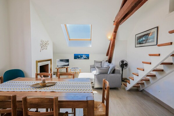This spacious apartment is in an old building (early 20th century), very quiet and bright all day long thanks to the many Velux windows and two large windows. With exposed beams in most rooms, you're sure to fall under its spell!Number 1 location in the heart of town, just 1 minute's walk from the station; Sleep 7 ━━━━━━━━━━━━━━━━━65 square meter apartment━━━━━━━━━━━━━━━━━The apartment is located on the 3rd floor without (last floor)One bedroom with a double bed 160x200 and a small deskA bedroom with a double bed 140x200, a single bed 90x200 and an adjoining shower room (shower and washbasin).A mezzanine with a comfortable new convertible sofa bed (rapido system).A fully-equipped kitchen A living room with sofa and a second deskAnother large bathroom with shower and bathtub.━━━━━━━━━━━━━━━━━Important━━━━━━━━━━━━━━━━━Please note that the use of the fireplace is prohibited.Parties are not allowed in the apartment. All entertainment venues are in the immediate vicinity!The apartment is located in a small, quiet family building, so please be careful not to make excessive noise, especially after 10 pm. ━━━━━━━━━━━━━━━━━Additional services and equipment━━━━━━━━━━━━━━━━━Bed linen and towels will be provided according to the number of occupants specified at the time of booking.Courtesy tray Raclette machineBaby equipment: Travel cot, 5 cm mattress (sheets not provided), and high chair.Ventilators / fanA guide to our favorite restaurants/ bars and activities is waiting for you!━━━━━━━━━━━━━━━━━Parking━━━━━━━━━━━━━━━━━1 private parking space━━━━━━━━━━━━━━━━━Walking distances & Accessibility ━━━━━━━━━━━━━━━━━Shops, bars, cinemas and restaurants are just a few steps away.2-minute walk to bakery 2-minute walk to train station5/ 15 minutes from town center and lake Bike rental (VELONECY, Cycle Rigobert, Yaka pédaler) and car rental in the neighborhood.━━━━━━━━━━━━━━━━━Just to be completely transparent :)━━━━━━━━━━━━━━━━━Our accommodation is located on the 3rd floor without an elevator. Those less accustomed to physical effort might prefer to abstain ;)━━━━━━━━━━━━━━━━━Frequently asked questions━━━━━━━━━━━━━━━━━Does the property have a balcony? NoHow does the deposit work?Airbnb does not collect the deposit at the time of booking. The platform simply checks with your bank to ensure that you are able to reimburse any damage you may cause during your stay.Are vacation vouchers and cash accepted?No, we only accept payment by credit card.Can the property be rented by the month at a reduced rate?All our accommodations are available for short-term rental only, and cannot be rented by the month at a reduced rate.Accommodation offered by Save My Bed