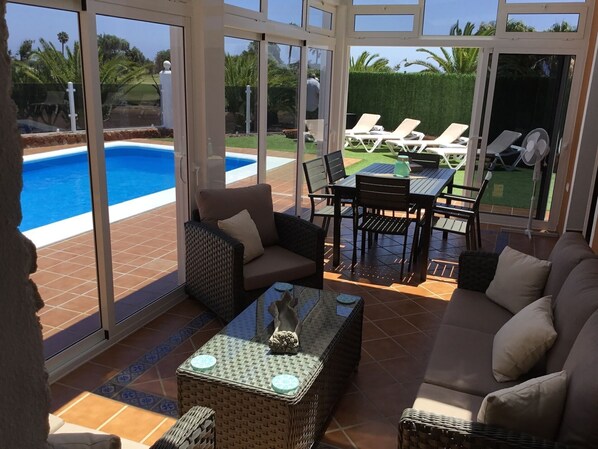 An extensive tiled area is available with an enclosed patio/sun room and alfresco dining for 6 people .There is an outside sofa, chairs and coffee table looking out to the pool.