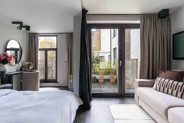One of the standout features of this suite is the personal sunlit patio, where you can relax with a book, enjoy a drink, or simply soak up the atmosphere. The cozy sitting area and modern design make this space a warm and inviting retreat after a day of exploring the city.
