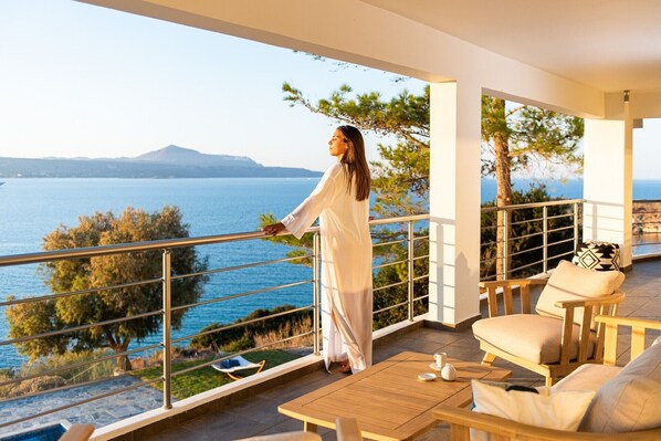 Beautifully situated property right above the water, with breath-taking views to the bay and beach of Kera, Souda Bay, the White Mountains, the open sea, and the Akrotiri. Nestled among native pine and eucalyptus trees, the villa is perfectly positioned on extensive grounds, offering stunning vistas from all rooms and outdoor areas, and amazing sunsets. The location is quiet and peaceful with the soothing lull of the sea, and the plot is completely private.