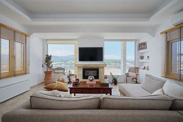 The Estate is ideal for large families or multigenerational groups of friends and offers a high degree of privacy. 14 guests are accommodated in beds, an extra 4 young adults or kids in sofa-beds and a baby in a cot .There are seven bedrooms with their own bathrooms. Toys and books available to keep kids happy indoors when overdosing under the sun. Baby cot is available upon request. Clean bed linen and towels are provided. Please feel free to ask for food service or any other request and we shall inform you on th eprice and availability. The open plan living areas are furnished with Greek themed art and linen and original antique pieces that belonged to the family for generations. 3 TVs are Smart LED HD but we'd rather you enjoy the company of those in your group. In case you still need to stay connected there is free wi-fi with a link-extension for the outdoor areas. The landscape with endless mountain views is ideal if photography, painting or writing is your hobby. You can enjoy the sun, the bright blue sky, the chirping of crickets in the garden and the endless view of the surrounding valleys, olive groves, vineyards, hills, nearby villages, and church steeples. There is a beautiful view of the valley and hills from tall, western-facing windows. Enjoy the outside seating areas (front veranda, back garden yard or pool area) that are very relaxing for sitting and reading in the sun or shade. If you practice yoga, bring your mats. It is wonderful to practice outside in the morning / evening. The private swimming pool is ideal for relaxation and games in water. A shower by the pool makes your life easier. In the evenings you can watch the sunset and spot the sparrows or swallows that fly to the pool to wet their bellies on the water. Please note that the swimming pool is not heated and is therefore in use from April/May to October/November. There is an outdoor courtyard in the back of the house with a few orange trees and a barbeque to cook with coal or olive trees wood. If you smoke we would appreciate it that you do so outside. Winters are mild and summers are fantastic with dry and warm days and cool nights. You would have the use of the entire property. Having said that, we might need to come by to water the vegetables garden, clean the pool or check upon the solar power measurements. To do so, we would first contact you via what's up. The roof is covered by solar energy panels because we collect electricity power from the sun. Upon arrival we can help you with anything else you might need (car rental, airport pick-up, reservations etc.). The airport and port are 15km away.