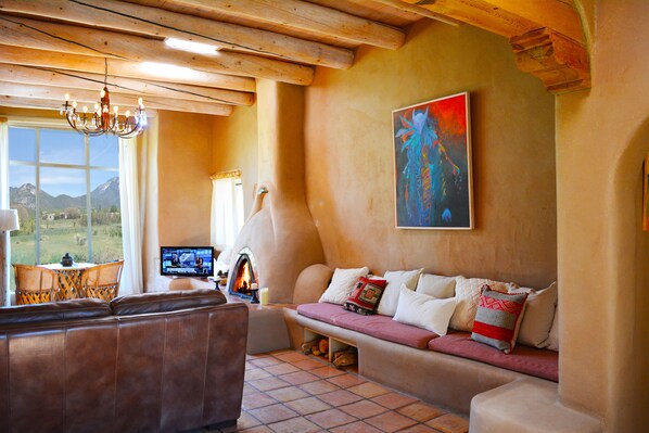 The kitchen is finally appointed with a toaster over, micro wave, a side by side refrigerator/freezer, a four burner gas range and oven, dishwasher, Delonghi automatic grind and brew coffee/espresso machines (coffee not included) and the most scenic El Salto and Taos mountain views available. Views can be enjoyed from the master bedroom, dining room, and living room. The living room and master bedroom have fireplaces which have been converted to "CANDLE ONLY"