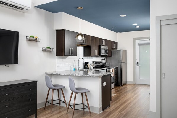 Le nostre 14 eleganti e spaziose camere rispettose dell'ambiente sono meticolosamente arredate con tutti i lussi di casa, rendendo il vostro soggiorno al River Row Flats confortevole, rilassato e personale. Dai tessuti lussureggianti ai prodotti da bagno di lusso alle vivaci opere d'arte locali che adornano le pareti, nessun dettaglio è stato trascurato!