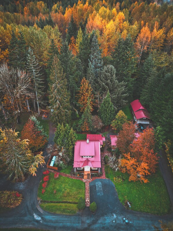 Our property, the "Ashford Lodge" is an old bed and breakfast that we bought and renovated in 2021, turning it into a fun rustic mountain retreat! There is a big main lodge, guest house (where Emmons is located), and vintage trailer "glampground", with hot tub, covered BBQ and picnic table, trails, and gardens.