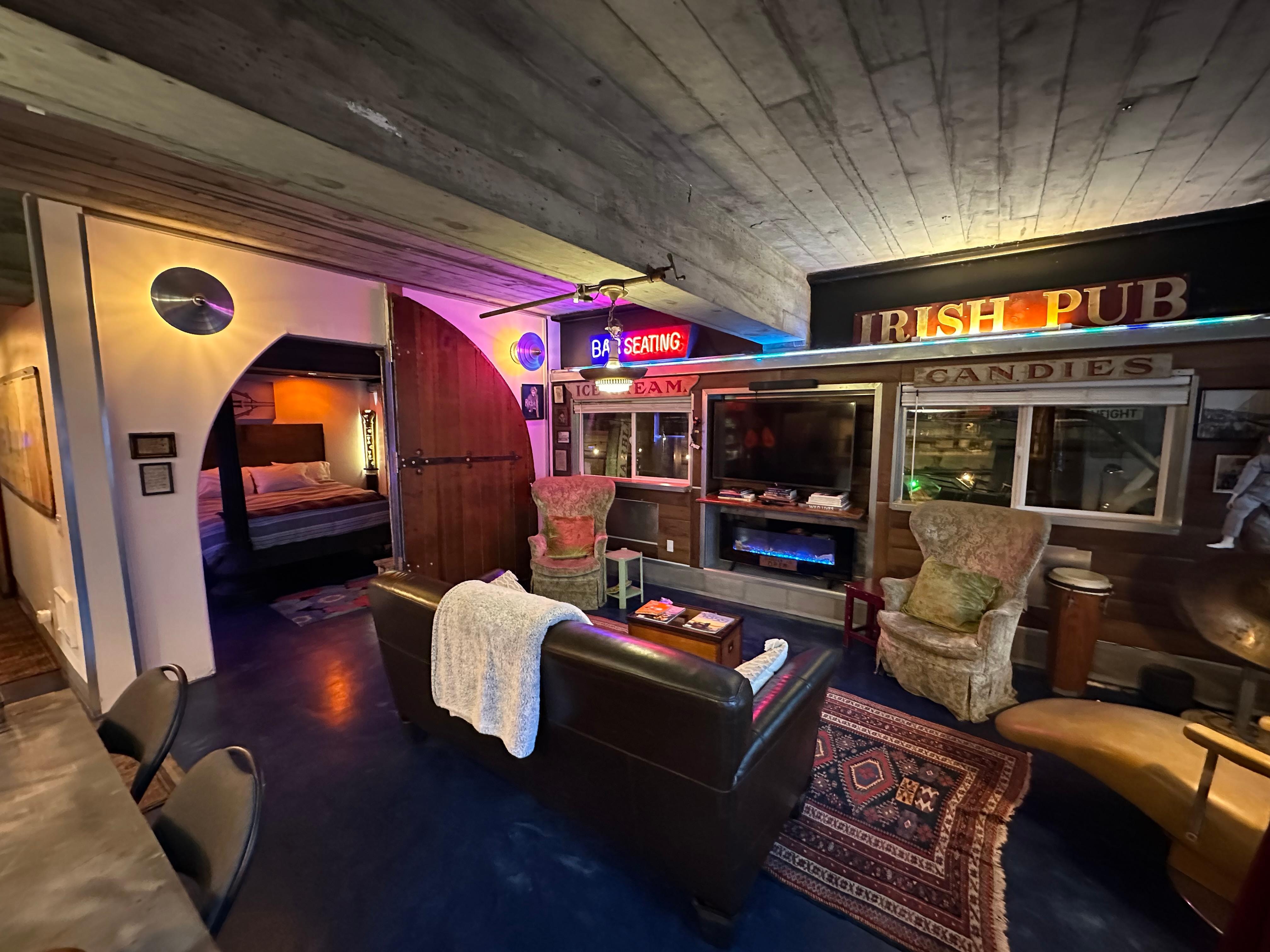 From the front patio, composed of historic downtown sidewalk slabs featuring grids of purple pavement prisms dating back to 1920s to the front doors preserved from the Seafarer restaurant or the grates from the old Astor Hotel, you cannot help feel transported back in time in our space.  This getaway nestled in the underground features an eclectic collection of signage and relics quintessential to experiencing the Astoria of the past. The nine foot church door framing the master bedroom, net racks from a local cannery, and signage from locations including the Peter Pan Market and Union Town Steam Baths are a few of the historic details you’ll notice throughout the property. Located on the edge of the Columbia River just inland from the ‘Graveyard of the Pacific’ we even boast a porthole from a ship and infamous origins. While these details will delight your senses, you will also have visual access to the underground tunnels through the windows in each bedroom and we invite each occupant to enjoy an Astoria Underground tour as part of their stay.