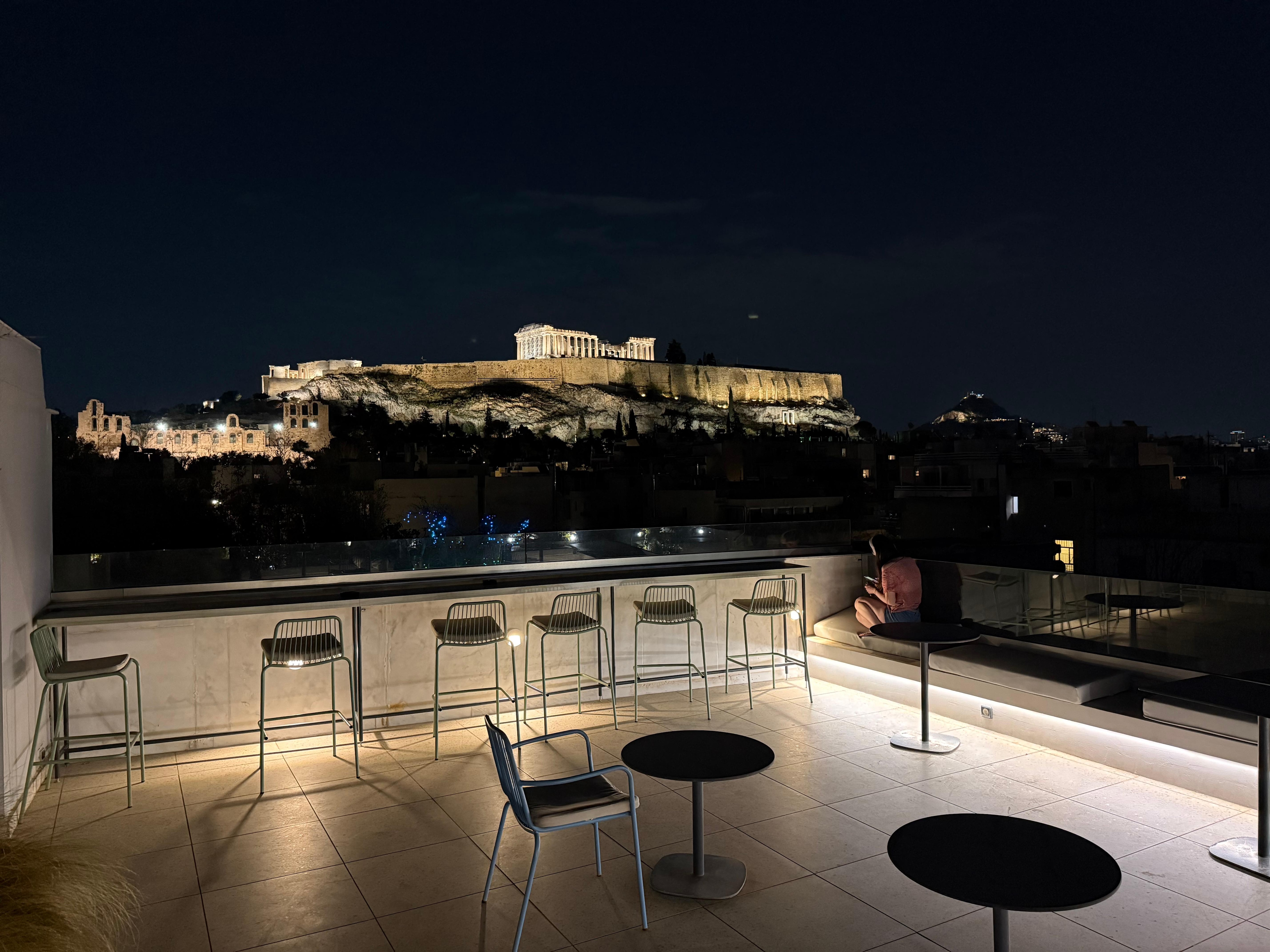 Rooftop garden view of the Acropolis is astounding, highly recommended at night.