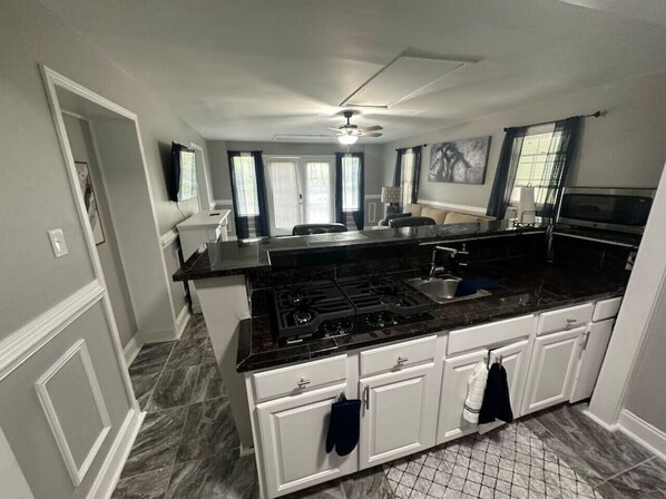 Adjacent to the living room is a well-equipped kitchenette, complete with a gas stove, microwave, coffee station, fridge/freezer, and mini sink. Plenty for you to whip up a simple meal at home with a cute dining area or the breakfast bar to enjoy your creation!