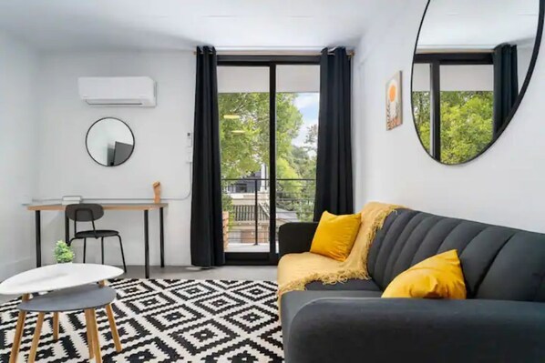 🛋 Modern & Comfortable Stay: Designed like a boutique hotel room, this stylish industrial studio apartment features a private balcony, a well-equipped kitchen, and a cozy living area—perfect for solo travelers, couples, or professionals.