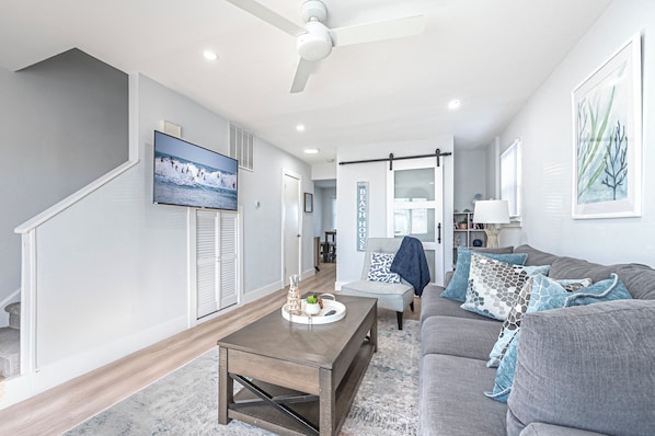 This residence features 2 bedrooms and 1.5 baths, with new beds and mattresses. Smart TVs adorn the bedrooms and living room (no cable). A compact workspace is situated in the living room. The well-equipped kitchen boasts stainless steel appliances, a coffee bar, and a dining area. Ground coffee and tea are complimentary. The backyard patio offers extra dining space and is an ideal spot for evening barbecues. Beach chairs and a wagon are provided for your convenience.