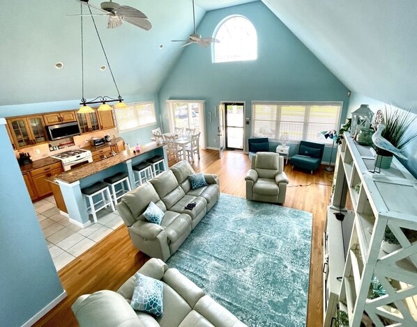 When you enter the front door using your unique key code, you’ll be greeted with a bright and airy great room with comfy reclining couches and two chairs that fold out into cots for additional sleeping.