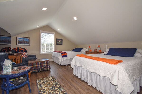 The apartment is decorated with Auburn flare and has a kitchenette with a small refrigerator, countertop ice machine, Keurig coffee maker, microwave, toaster and a nice dining table with seating for 4. There are two queen size beds, a small seating area with a big screen TV, and a bathroom with a standing shower. Book KTJ Studio today for a perfect visit to the Auburn/Opelika area and War Eagle!