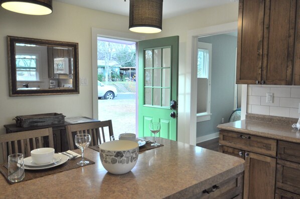 posate, pentole e padelle e praticamente tutto ciò di cui potresti aver bisogno per cucinare per un weekend o una visita di un mese. Devi solo comprare la spesa mentre ti forniremo un assortimento di erbe, spezie, caffè e tè per il tuo piacere. Il soggiorno ha un comodo divano componibile in pelle con HDTV via cavo, internet ad alta velocità e lettore DVD. La grande camera da letto ha un letto matrimoniale con un materasso Serta, lenzuola ad alto numero di fili e comodi cuscini, ampio spazio armadio e cassetti integrati con una piccola scrivania con una presa per il computer. Coperte e biancheria da letto extra sono lì se necessario. Plum Cottage ha molte finestre e si sente luminoso e allegro mentre decorato con gusto. Pavimenti di bambù in tutto. Lavatrice e asciugatrice sono nei locali.