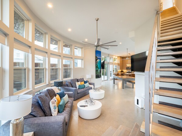 Open Living/Dining/Kitchen with Smart TV's in Living Room & Dining Room.