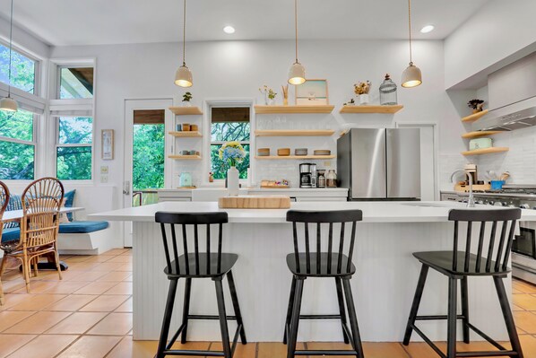 Well-equipped for longer stays with fiber internet, multiple workstations, high-quality cookware, and King Beds in every room. The charming home is 2,043 sq ft.