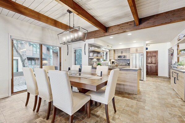 Gather in the sunlit living area, where a plush sectional and a cozy fireplace make it the ideal space to unwind after a day on the mountain or the golf course, depending on the season. Enjoy the true feel of nature, with wildlife frequently making an appearance on the course in every season. The well-equipped, full kitchen is ready for your favorite meals, and the adjacent dining table comfortably seats eight for family dinners or game nights, with lots of game options provided for all ages. The Laundry room features oversized machines if needed during your stay.