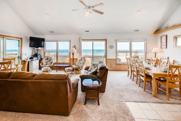 OCEANFRONT Avon-Moore Way. Come suggerisce il nome, questo affascinante rifugio si trova proprio accanto al surf - in una piacevole strada senza uscita nel centro di Avon - ma è anche comodo per l'Avon Pier, l'ufficio postale e una varietà di incantevoli negozi e ristoranti. Il piano terra ha due posti auto coperti, una doccia esterna e un comodo tavolo per la pulizia del pescato del giorno. Quattro camere da letto al secondo piano con tre camere da letto che offrono accesso diretto ai ponti con vista sull'oceano, così come la spettacolare master suite al terzo livello. Non c'è niente di meglio che appoggiarsi alla ringhiera di un ponte sull'oceano, prendere il caffè del mattino e guardare la risacca. C'è un modo migliore per iniziare ogni giorno? Oltre a comode camere da letto, il terzo livello dispone di una splendida sala splendidamente decorata con soffitto a cattedrale, cucina e zona pranzo, e viste a bizzeffe. Completando i servizi si accede a una vasta videoteca. Quando sei SURF SIDE, cosa puoi volere di più?