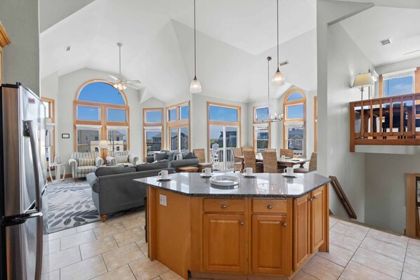 The fifth and final bedroom, a king master suite with a flat screen Smart TV, large bathroom, and access to the top-level sundeck is located on the third level. This bedroom opens its French doors into the great room, a space that conjures the real magic of bringing your family together. Enveloped by a clean and crisp design, this communal living space is open, airy and light-filled. The spacious kitchen, featuring stainless appliances and granite countertops, has everything you need to feed a hungry crowd either at the four-stool breakfast counter or the eight-seat dining table positioned by two walls of windows for a perfect view. While the great room features a large flat screen TV and DVD player, the must-see watching will most likely come from the deck, where settling into new outdoor furniture with a cool drink you have fixed at the bar will likely be the start of each day’s end. When it comes to a long-anticipated getaway, the waiting is the hardest part. Book SEA YOU SOON now and it will be here sooner than you think!