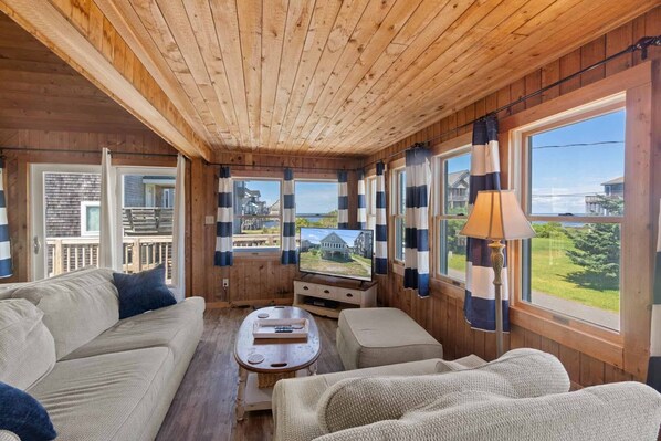 The second level loft has a queen master bedroom, access to a sun deck with built-in seating overlooking the canal and sound, a full bath, and cozy game room space with a foosball table. The living area and each bedroom all feature TVs. For your added convenience, board games and puzzles are provided for rainy day or evening fun!