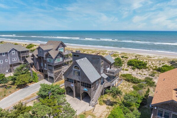 OCEANFRONT — Greenwood Place — Settle into the awe of nature’s presence nestled in a pristine dune-top perch at SEASHELLA. Outside, the seaside panorama is salve for the soul. Inside, warm Juniper wood and calming shades of blue are subtle reminders of the tamed wildness of Hatteras Island. Set back from the road, SEASHELLA offers two covered carports, two outdoor showers, a fish-cleaning table, and a private boardwalk that provides convenient dune-crossing access to the beach.