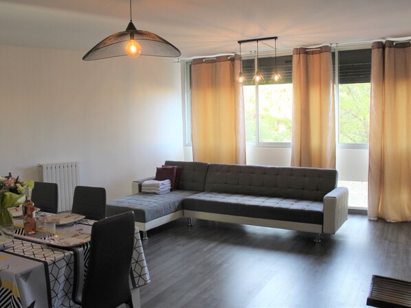 Cet appartement de 80 m² est au 2ème étage sans ascenseur et dispose d'un balcon. Il est classé ⭐⭐⭐ étoiles et orienté Est/Ouest. L'appartement est non-fumeur, non accessible PMR et les animaux ne sont pas admis. Le séjour est équipé d'une télévision et d'un canapé. La cuisine est entièrement équipée avec des plaques vitrocéramiques, un four traditionnel, un micro-ondes, un frigo-congélateur, un lave-vaisselle et un lave-linge. La salle de bains comprend une baignoire et les toilettes sont séparées. La première chambre dispose d'un lit en 140 cm et la seconde chambre de deux lits en 90 cm.
