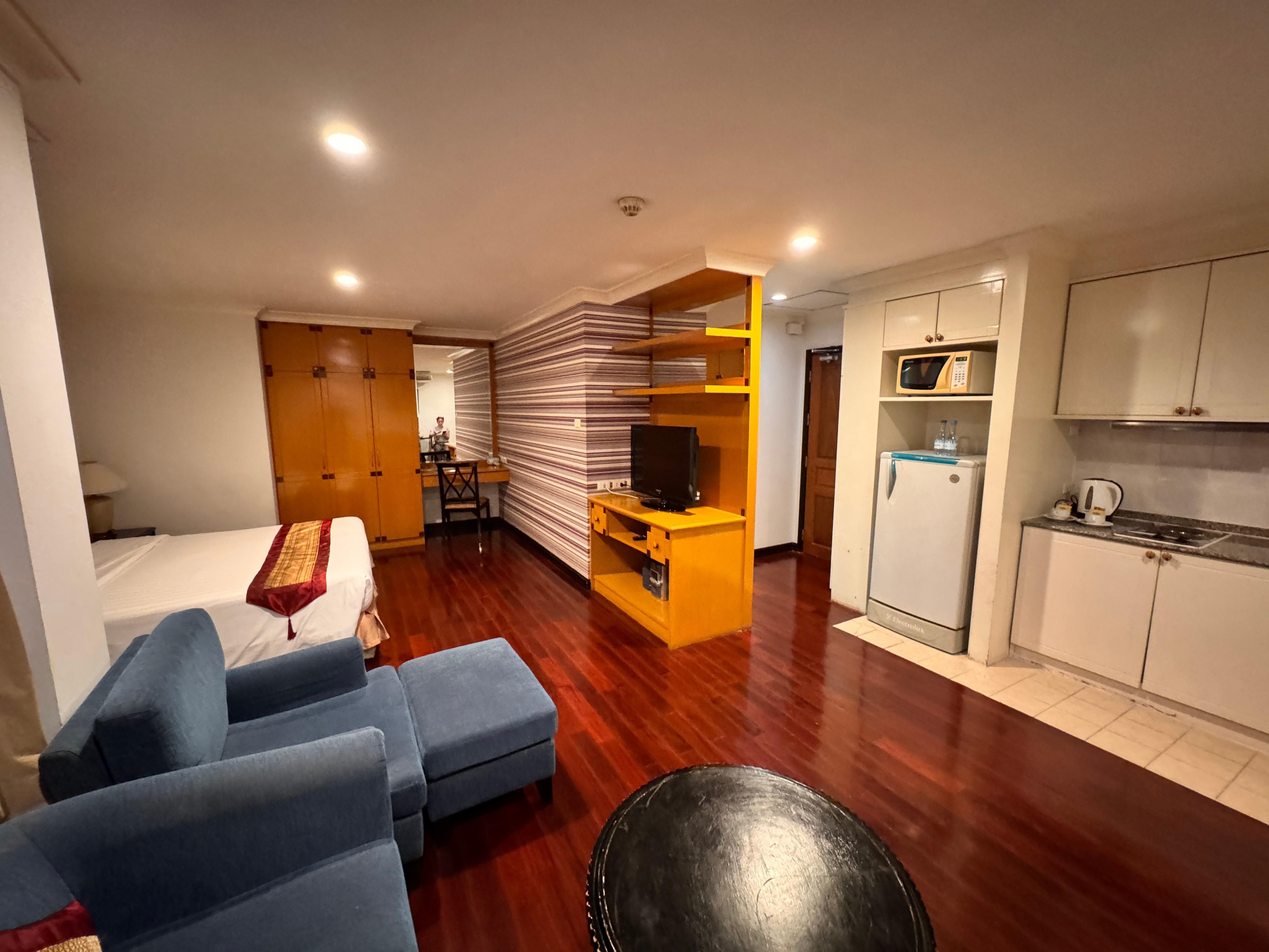Friendly staff, convenient location, kitchen with microwave and electric stove. Good for longer stays or with family. Has small balcony. Large refrigerator (at least in the plus room) car parking available. Was basically a jr suite in size.