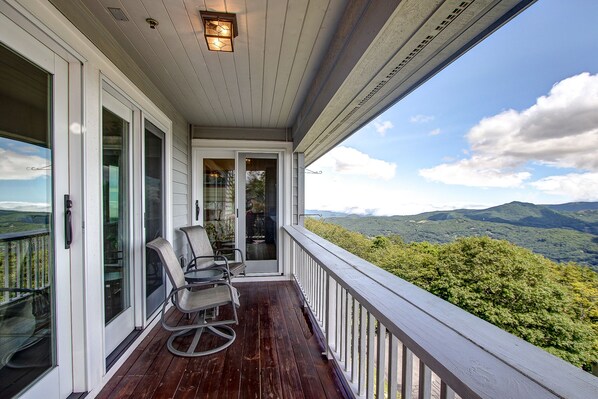 Beechin' Views offers an open floor plan that includes a family room with vaulted ceilings and gas logs in the fireplace. A Kitchen with granite, steel appliances & is fully equipped-bakeware, dinnerware, & a bar area. Spacious primary suite with king size bed & views of Grandfather mountain from the bed plus En suite bath with jetted tub. Second bedroom has high end sleeper sofa & a built in office space-ideal to work from home. Family room also has a sleeper sofa. Direct views of Grandfather Mountain, Sugar Mountain, Hanging Rock, Linville Peak & at least 5 others! Did we mention the views are AMAZING?? Walk to shops & restaurants-near all town amenities. Easy walk to Overlook Barn Venue. Can be booked for lower rates for weeks or months.