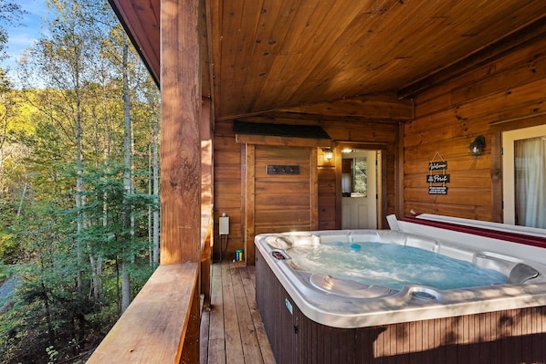 Entra nella cabina attraverso la cucina con i suoi elettrodomestici in acciaio inossidabile e i contatori di granito. Attraverso un arco si trova la sala da pranzo con il soffitto a volta svettante a cattedrale, con spazio per 8 al tavolo. Il soggiorno è appena oltre, arredato con lussuose sedie e divani in pelle disposti attorno a un camino a gas con una HDTV montata sopra di esso. La vasca idromassaggio si trova su un ponte privato coperto a cui si accede dal soggiorno, e dall'altro lato della stanza c'è una porta sul ponte all'aperto con un completo da pranzo all'aperto.