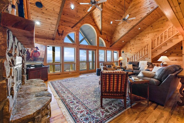 This stunning three-level cabin can accommodate up to 21 guests with six bedrooms and plenty of room to spread out or gather together. The main level great room has a wall of windows overlooking the long-range mountain views, wood flooring, and high vaulted tongue-and-groove ceilings. Oversized leather furniture arranged around the gas log fireplace and big screen Smart TV with cable provides a comfortable, relaxing place to enjoy company. The great room flows into the expansive, upscale kitchen and dining room with a banquet-style dining table. The sunroom just beyond the kitchen has a sitting area and breakfast table surrounded by windows overlooking the natural, peaceful setting. The lower level boasts a game room with a pool table, ping pong table, darts, and a wet bar, providing fun for the whole group. Enjoy the mountain air and Blue Ridge Mountain views from the upper or lower deck.