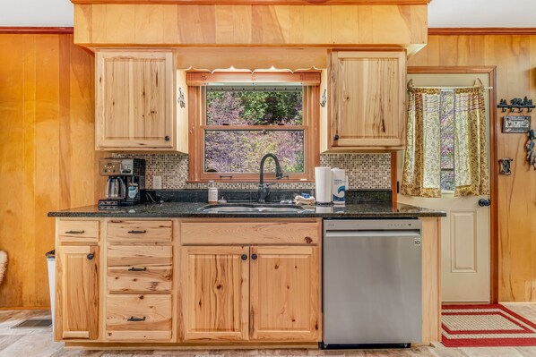 Upon entry, you'll be met with a bright interior and a cozy atmosphere throughout the well-appointed living area. Relax and make yourself at home by resting on the plush furniture, streaming a movie marathon on the large TV, or curling up with a good book by the fireplace. Every window offers picturesque views of the area, making you feel like you've stepped into a whimsical forest. Prepare grand meals and outdoor snacks in the sophisticated kitchen, equipped with ample cupboard room, capable appliances, and a formal dining table. Comfortable beds in spacious bedrooms ensure everyone receives a wonderful night's rest from the day's adventures. A washer/dryer is provided for the ultimate convenience.