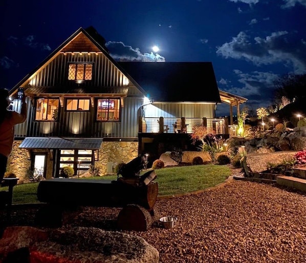 Step outside and take in panoramic vistas spanning three states, with a tranquil valley and winding creek below — the perfect backdrop for morning coffee or evening wine. Whether you're soaking in the private hot tub under the stars or gathering around the cozy fire pit with loved ones, the outdoor spaces invite relaxation at every turn.