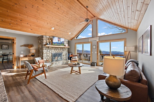 Wildcat Chalet is an upscale mountain cabin with tasteful yet comfortable decor throughout. The main level features an open-concept floor plan, open to the mountain view from the wall of windows. The leather furniture surrounds the large, flat-screen TV and stacked stone wood fireplace under vaulted tongue-and-groove ceilings. The covered deck provides a comfy setting to take in the sweeping Blue Ridge Mountains, with outdoor dining, a gas fire table, and a charcoal grill.