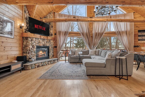 🔹As you walk in, you'll be greeted with a luxury log cabin feel as you see the floor to ceiling windows and massive log beams stretching end to end. The living room hosts a large sectional couch and serves as a focal point of the home.