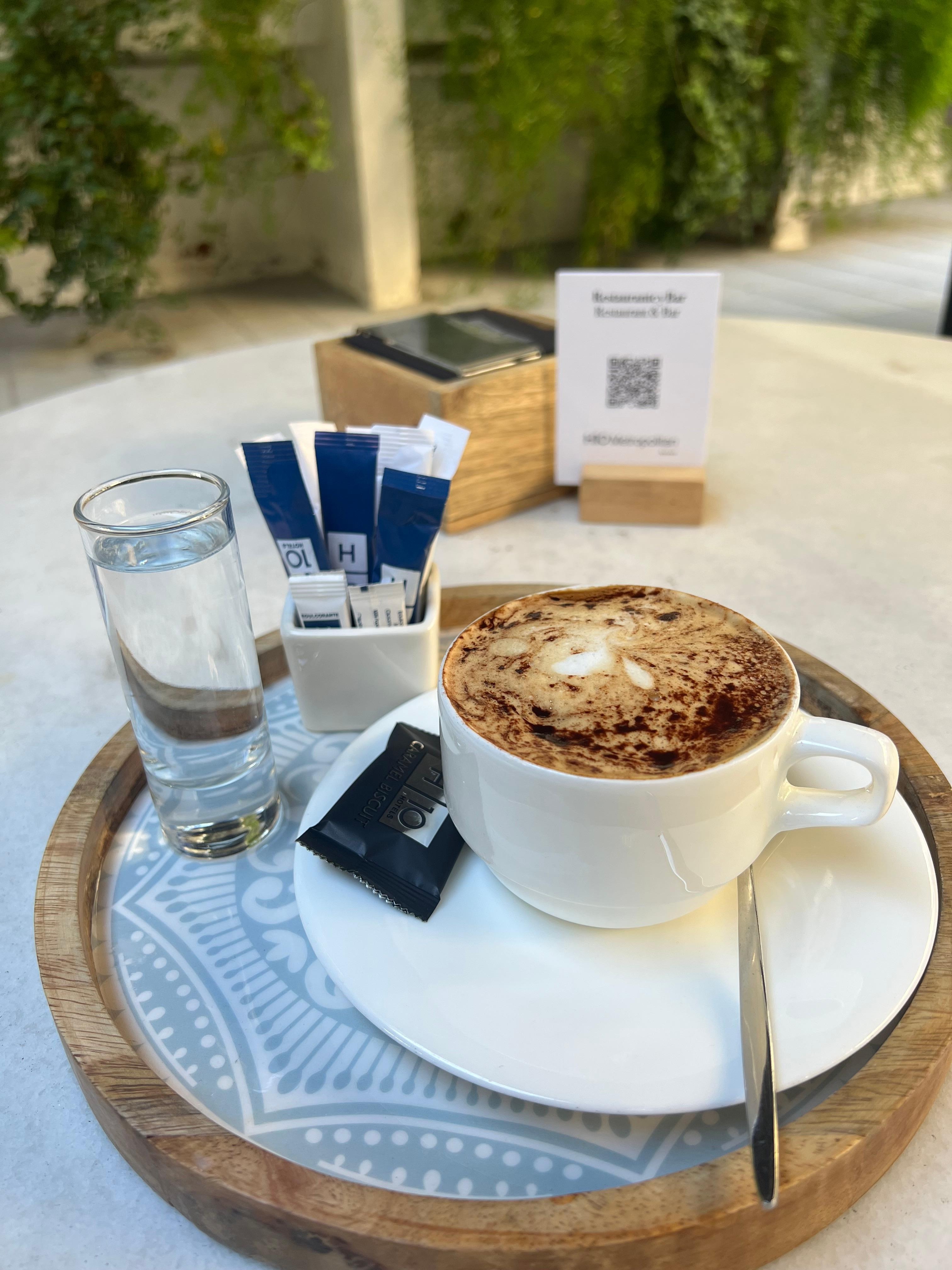 The hotel is in a great location, has a lovely bar area and a couple of small pools if you fancy a dip.