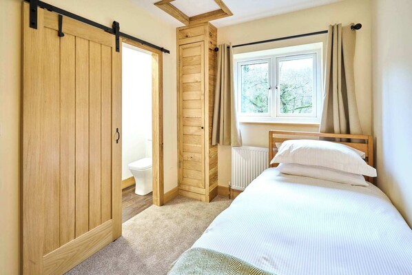 The property comprises four tastefully decorated bedrooms, all enjoying views of the surrounding woodland. These include one king-sized bedroom, one double bedroom, one twin room with two single beds, and one single bedroom. Each room has been thoughtfully styled to create a restful and welcoming atmosphere.