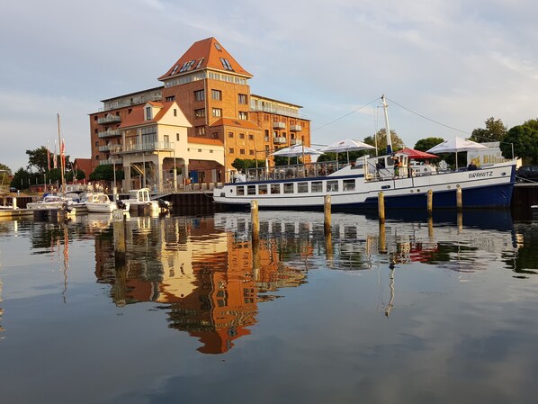 Indipendentemente dalle grandi finestre panoramiche da cui guardi, hai una meravigliosa vista sul porto e sulla leggendaria baia. Con una vista in lontananza sull'acqua, sul Mar Baltico e sui Darss, troverai la pace che la gente si alza nella culla. Guarda il treno delle gru in autunno, i gabbiani sulle barche a vela o solo la nonna e il nonno che si godono un panino di pesce laggiù e dimentichi tutte le preoccupazioni.