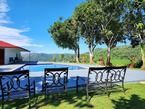 The unit is located in the Cascada Azul community, which is a very safe and quiet community. It is one of 10 units nestled on a Jungle bluff overlooking the majestic Baru River Valley. With the exception of the occasional visit from Toucans, Macaws, Agoutis, Coatis, and Monkeys that patrol the area, you will have complete privacy. The condo has one private bedroom with a Double bed, nightstands, and a custom wardrobe to hang and store all of your belongings. The bathroom has a large shower, a spacious countertop and sink, drawers for storage of towels and toiletries, and YES, we have on demand hot water! The living room and kitchen are one open space with a sliding door that opens to your private back patio, that incredible view and ever changing ocean sunsets. There is a custom futon/sofa bed that folds out to sleep 1-2 people. The furniture is handmade by local woodworkers with native wood. The kitchen is fully furnished with dishes, silverware, utensils, etc. It also has a full refrigerator, freezer, stove, blender and microwave. There is a small dining area inside as well as patio furniture should you want to eat outside. The television has cable, and you are welcome to use your own streaming devices as well. If you would like to utilize the grill, it is shared and located near the pool. We also offer free access to the washer and dryer and just ask that you be mindful and considerate of other guests.