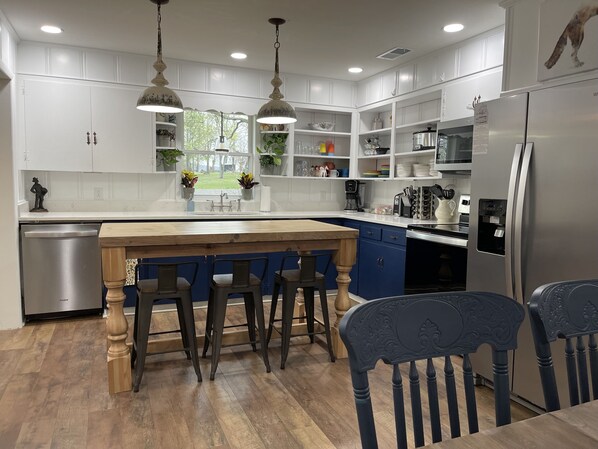 Fresh linens and towels are supplied. The kitchen is fully supplied with pots, pans, dishes, coffee pot, cups, silverware, bakeware, storage containers, crockpot, wine glasses, hand mixer, spice rack, and more!
