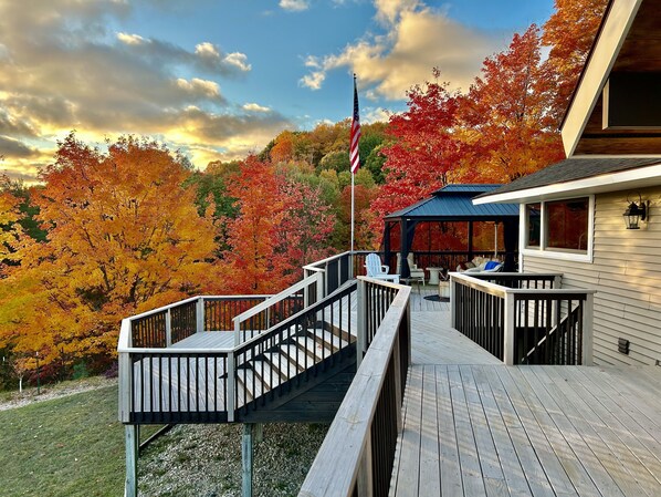 Imagine kicking back on 1400 SF of deck where you can peacefully relax while taking in the breath-taking views and panorama. Wildlife frequents the property. Bald Eagles, red hawks, deer, foxes abound …. a view that you’ll never grow tired of. Summit and Schuss Mountains in the distance east and the Torch Lake Cellars winery settled on a mountain top across the Lake from our home to the west. There is a 20 x 12 foot gazebo on our deck which is our favorite place in the house. It’s an outdoor living room with the same spectacular views we’ve been talking about. We have both living and dining furniture under this covered porch which has the most remarkable views of Lake Bellaire!