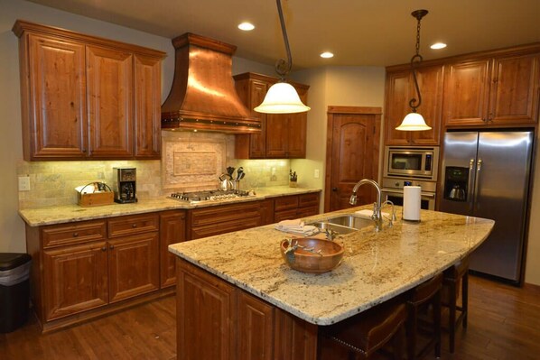 -Il tavolo da pranzo ha posti a sedere per 8 adiacente a una bella cucina aperta con posti a sedere contatore per tre, una stufa a gas a 6 fuochi, e tutte le pentole e gli elettrodomestici che ci si aspetterebbe o bisogno in una casa di lusso.