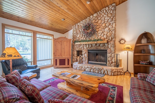 • Spacious living room décor is warm and comfortable featuring a large wood-burning fireplace & flat screen TV with DVD/Blue-Ray