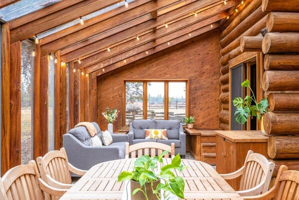 - Spacious sunroom with cozy couches, string lights, and an extendable teak dining table for 8 (heater and portable AC for extended use)
